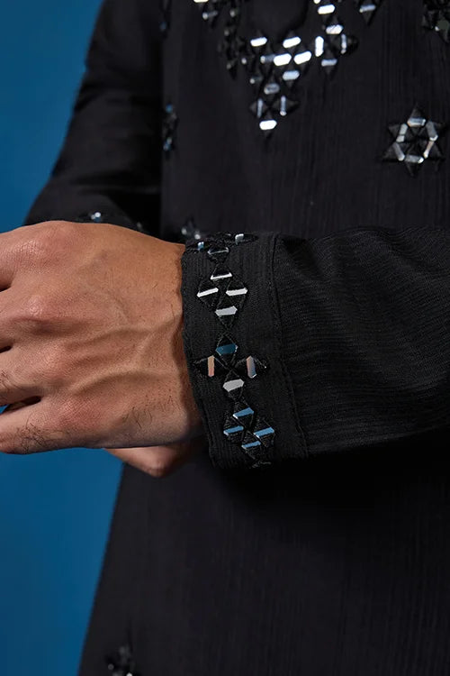 This Black Mirror Work Kurta Pant Wedding Outfits For Mens Combines Traditional Craftsmanship With A Modern Fit, Ensuring Comfort Throughout Long Functions And Ceremonies.