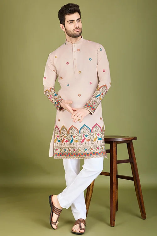 If You're Searching For A Versatile Yet Sophisticated Ethnic Outfit, The Designer Ivory Viscose Silk Men's Kurta Is An Impeccable Choice. The Rich Ivory Hue Exudes Timeless Charm, Making It A Must-Have Addition To Every Man's Wardrobe.