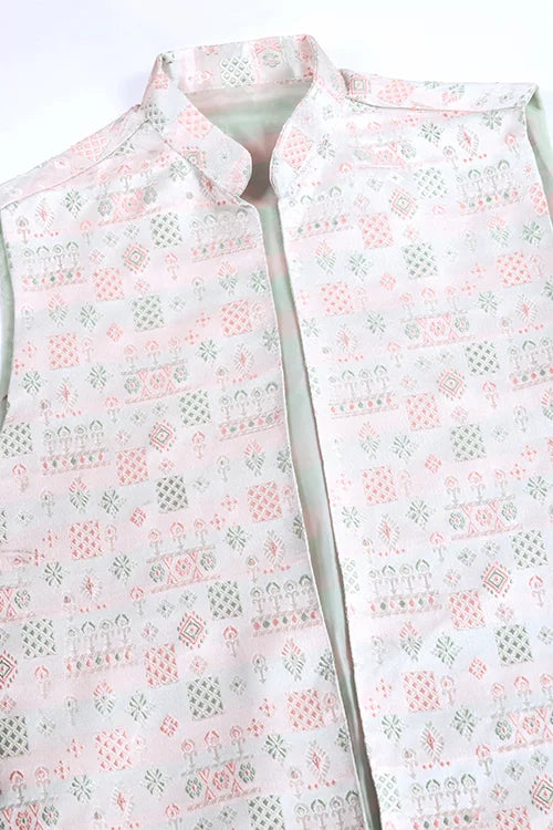 This Designer Kurta Set Is A Statement Piece That Showcases Exceptional Craftsmanship And Attention To Detail. The Jacquard Work On The Open Koti Jacket , Creating Hand Mirror Work Kurta. The White Hue Is Trendy Yet Traditional, Ensuring A Sophisticated And Eye-Catching Look.