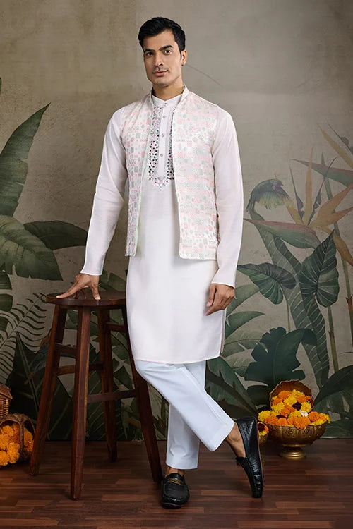 Introducing The Designer White Kurta & Open Koti For Men, A Timeless Ethnic Ensemble Crafted To Exude Elegance And Tradition. This Outfit Is The Perfect Blend Of Style And Sophistication, Making It Ideal For Weddings, Festivals, And Special Occasions. Traditional White Kurta.
