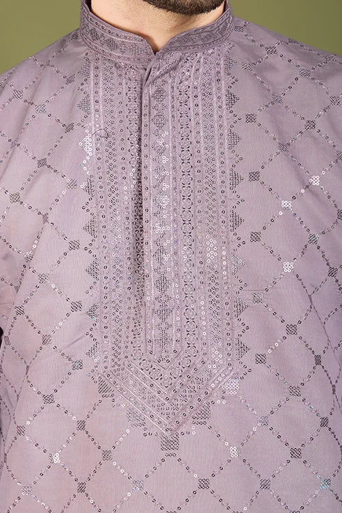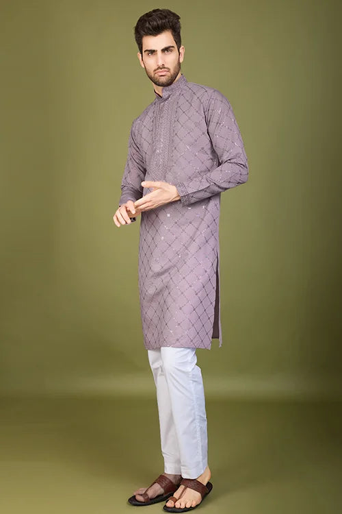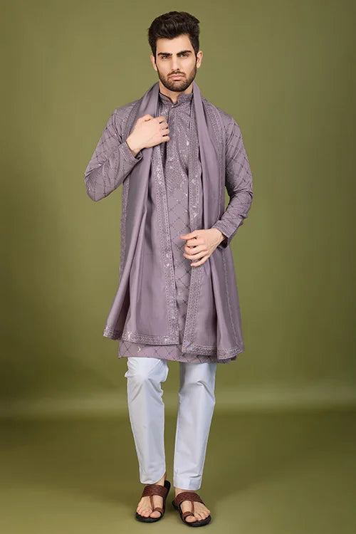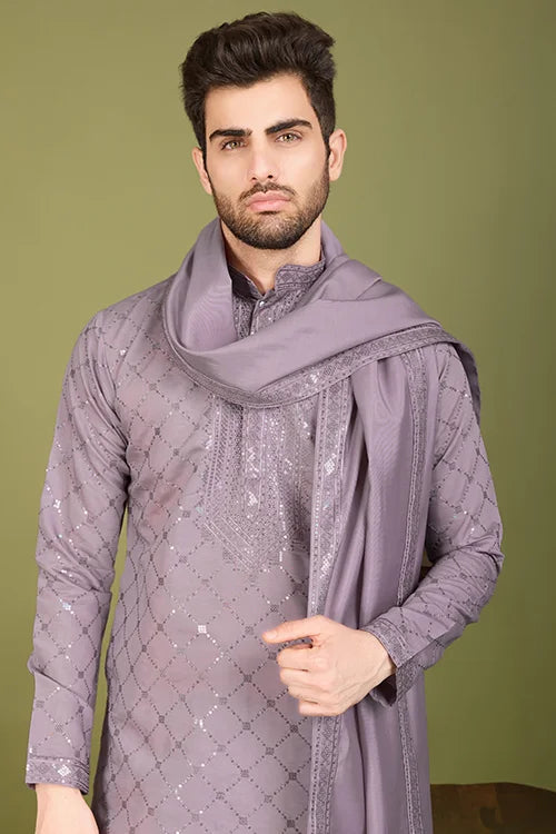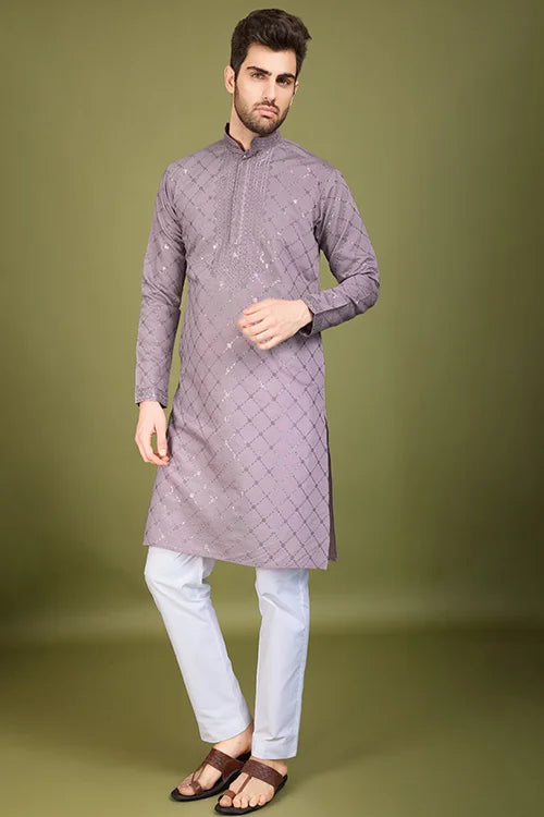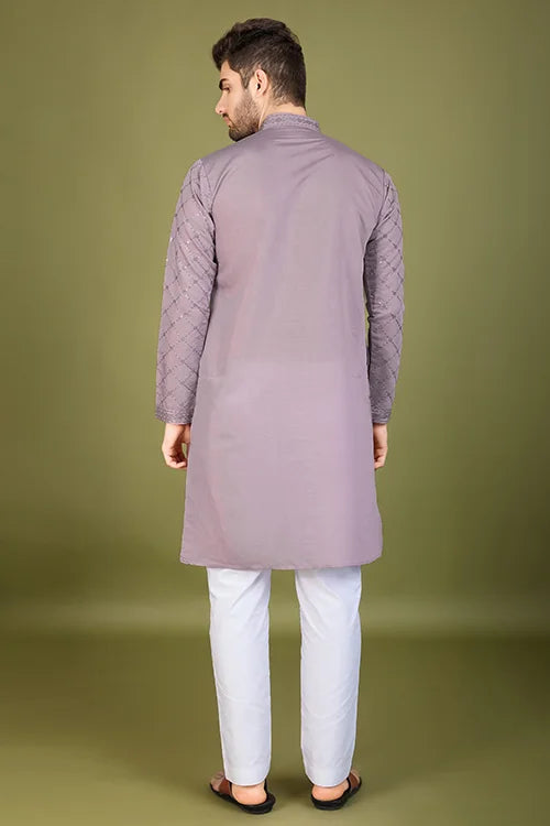 A Viscose Silk Kurta Is A Timeless Addition To Every Man’s Wardrobe. This White Silk Kurta Designer Premium Fabric, Offering A Smooth Texture, Lightweight Feel, And Breathable Comfort. Designed Dusty Peach Intricate Thread And Sequence Work, This Embroidered Silk Kurta Men’s Festive, Weddings, And Celebrations.