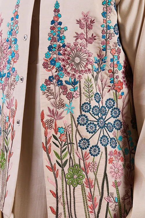 The Beige Koti Kurta Set For Mens Wear Adds Timeless Charm And Sophistication To Every Special Occasion. This Designer Outfit From Shubhkala Store Showcases A Luxurious Beige Tone Crafted From Premium Silk Fabric, Giving It A Smooth Finish And Elegant Shine.