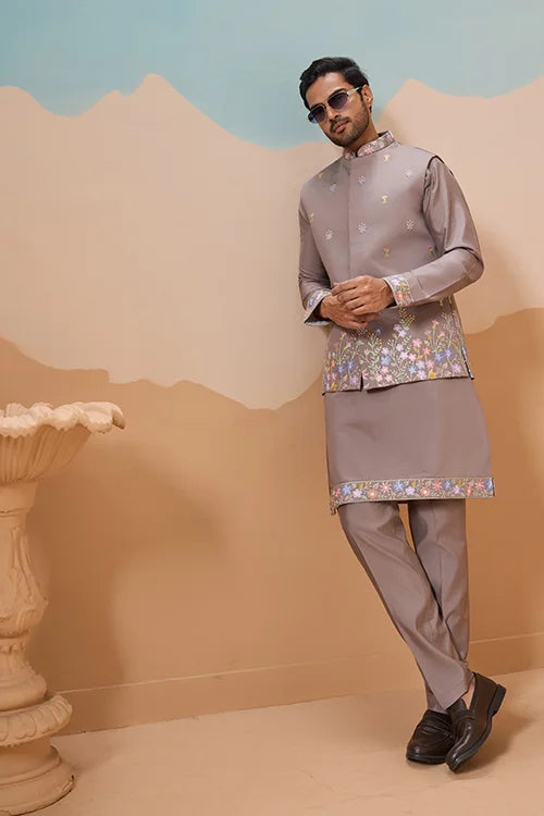 Elegant Grey Embroidered Koti Kurta Pant for Mens