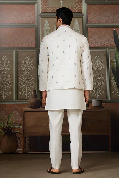 Crafted From Premium Viscose Silk Fabric, This Set Includes A Beautifully Embroidered Kurta, A Matching Koti, And A Bottom In Pure White Color, Making It A Versatile Outfit For Weddings, Festive Occasions, And Cultural Functions.