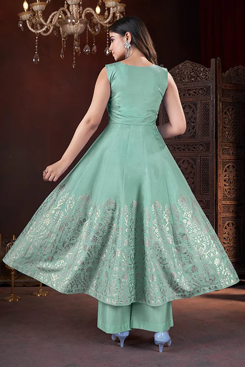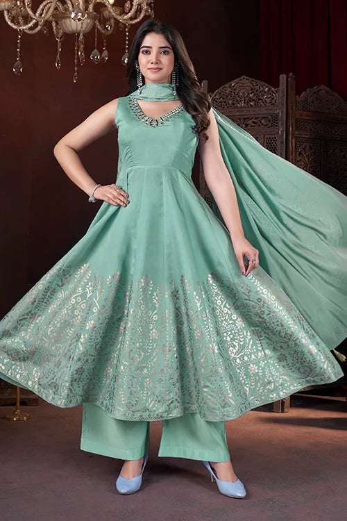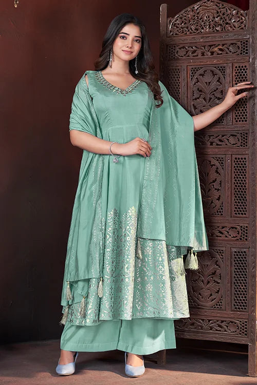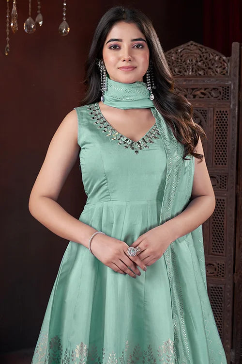 Make A Statement At Any Festive Occasion With This Pista Color Roman Silk Foil Printed Festival Salwar Suit. Designed To Enhance Your Elegance, This Ensemble Features A Luxurious Roman Silk Fabric Adorned With Exquisite Foil Print Work And Hand Mirror Embroidery On The Neckline. Whether You're Attending A Wedding, A Festive Gathering, Or A Traditional Function, This Outfit Exudes Grace And Sophistication.