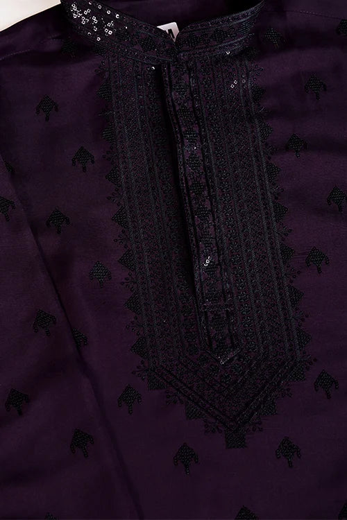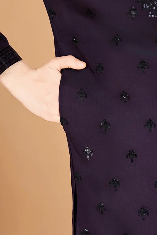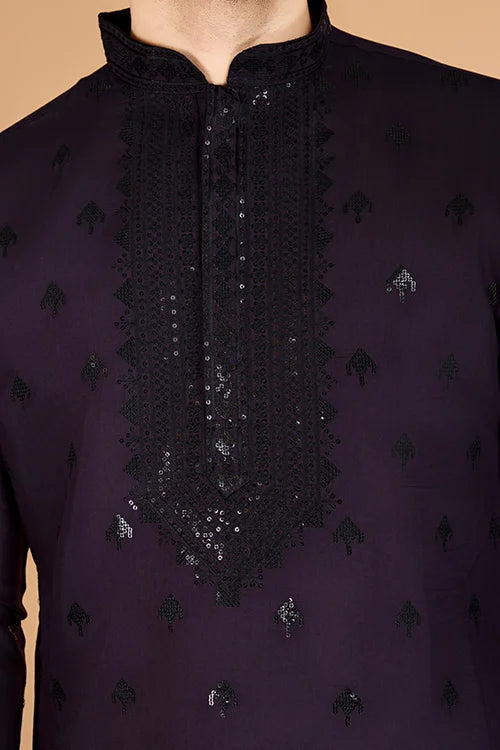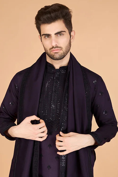 Crafted From Premium Viscose Silk Fabric, This Kurta Offers A Luxurious Feel And A Sophisticated Look. The Purple Hue Adds A Timeless Charm, Making It Suitable For Various Occasions, From Events. The Stylish Purple Kurta For Men Embellishments Enhance Its Men's Black Designer Kurta.