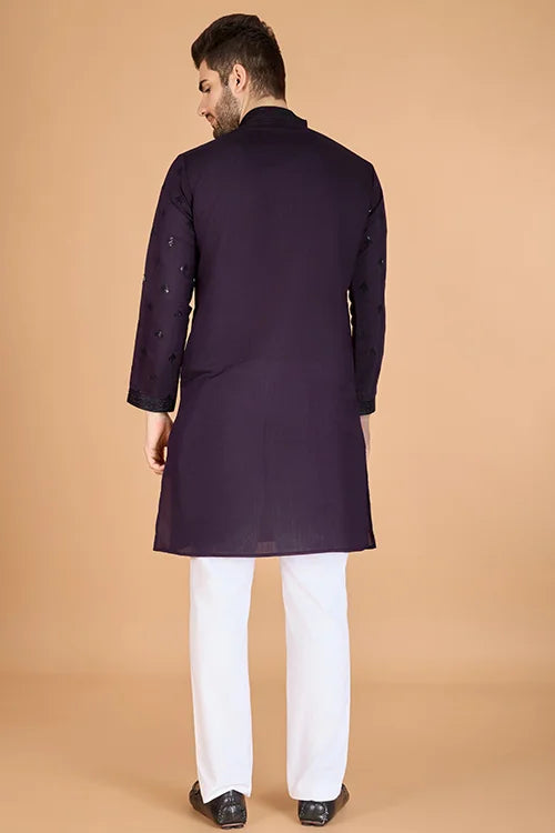 The Purple Thread Work Men's Kurta Meticulous Attention To Detail. The Patterns Are Thoughtfully Designed To Add A Subtle Yet Striking Embellishment, Enhancing The Overall Look Without Overwhelming The Simplicity Of The Design. This Balance Between Decoration And Simplicity Makes The Kurta Versatile, Suitable For Both Grand Occasions And Intimate Gatherings.