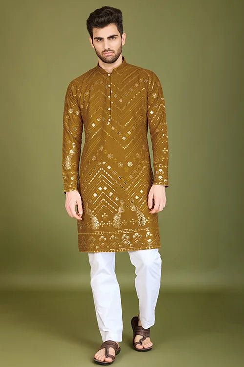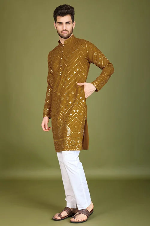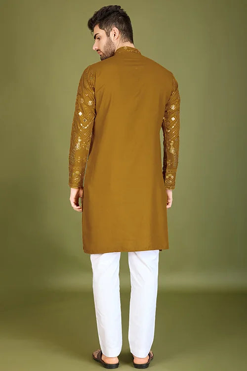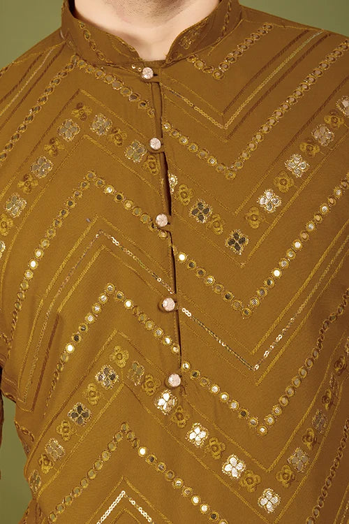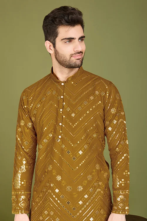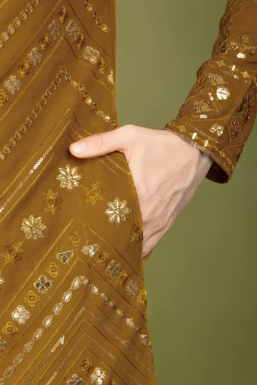 Experience The Perfect Blend Of Tradition And Style With This Traditional Embroidered Sequence Work Yellow Men's Kurta, Exclusively Available At Mdlifestyle. Crafted From Premium Silk Fabric, This Kurta Offers Elegance And Comfort. The Intricate Embroidery And Exquisite Sequence Work Add A Touch Of Luxury. It's Ideal For Festive Occasions, Weddings, Or Traditional Gatherings.