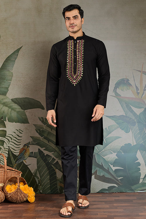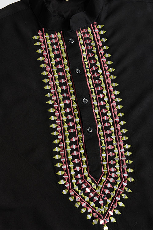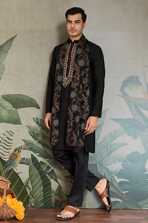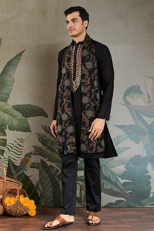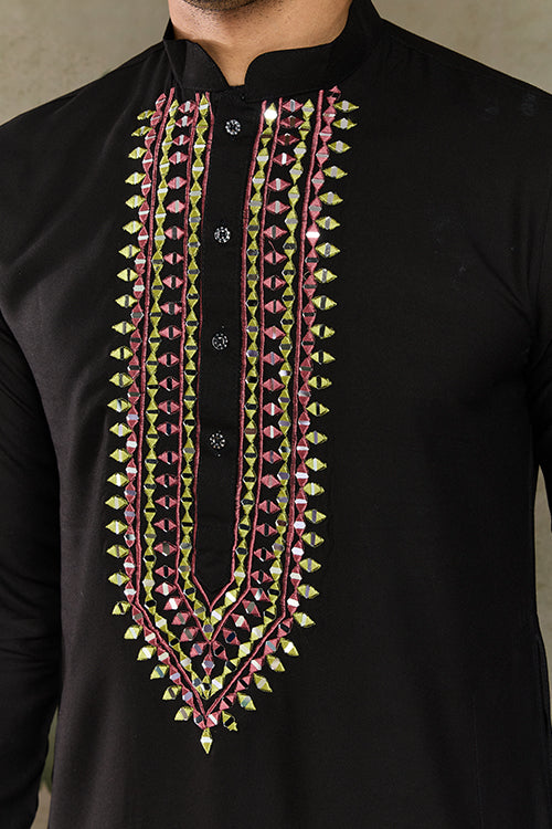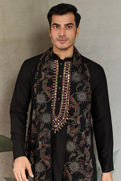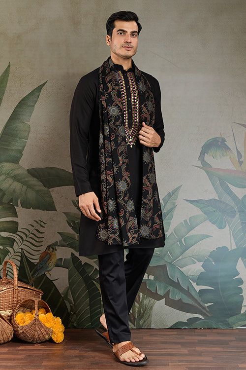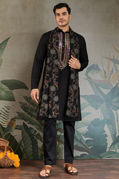 Wedding Special Black Mirror Work Kurta With Dupatta For Men