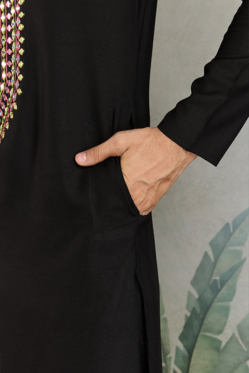 Discover Timeless Elegance With Our Black Mirror Work Kurta For Men, Designed Especially For Weddings And Festive Occasions. This Stylish Kurta Is Crafted From Premium Viscose Rayon And Adorned With Intricate Thread And Real Mirror Work. The Soft And Breathable Fabric Ensures Comfort While Offering A Regal Appearance. The Set Includes A Matching White Dupatta Made From Viscose Rayon, Printed With Subtle Foil Work For A Refined Traditional Touch.