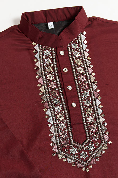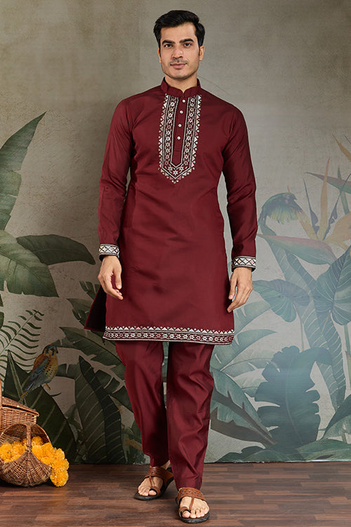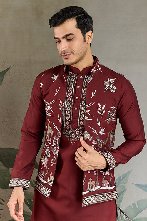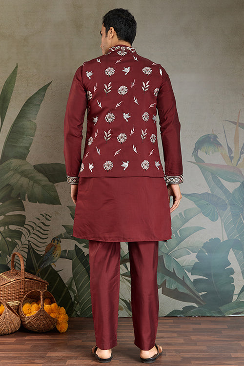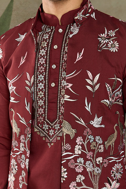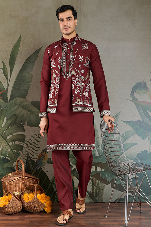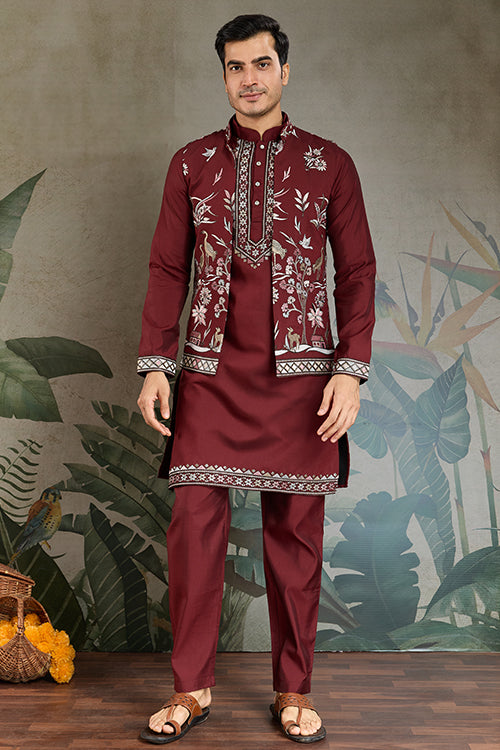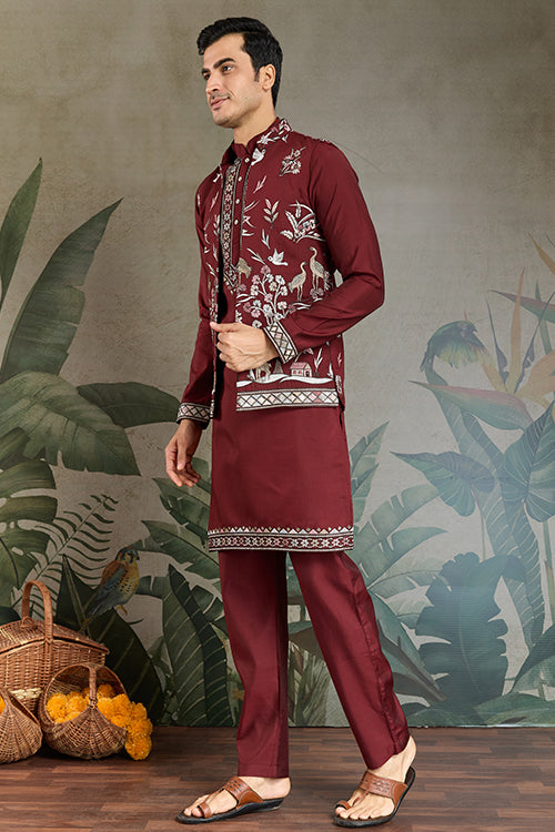 Wedding Special Maroon Jacket Style Kurta Pajama Full Set