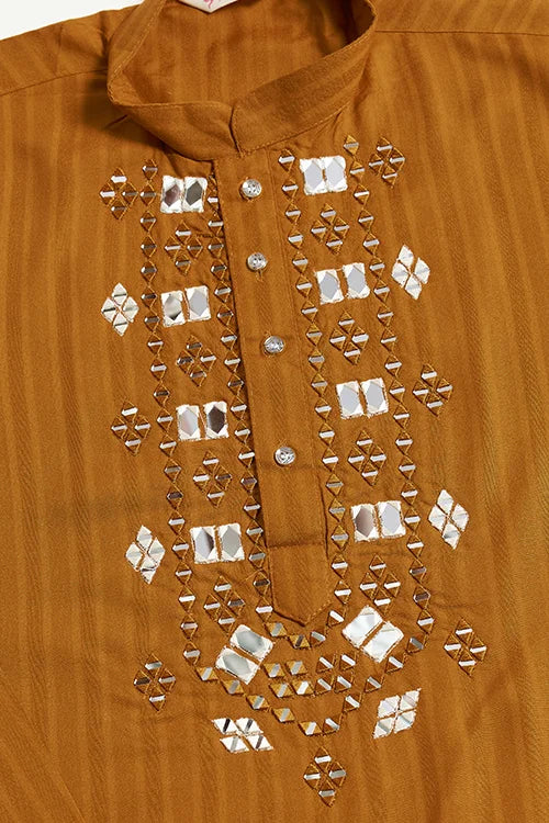 Elevate Your Ethnic Wardrobe With Our Wedding Special Mustard Mirror Kurta Set With Dupatta For Men – A Refined Blend Of Elegance, Craftsmanship, And Tradition. This Meticulously Designed Outfit Features A Rich Mustard Kurta With Intricate Mirror Work On A Self-Jari Weaving Fabric That Radiates Class. Paired With A Matching Dusty Mustard Dupatta And Crisp White Cotton Bottoms, This Ensemble Is Ideal For Wedding Celebrations, Sangeet, Festive Evenings, Or Cultural Gatherings.